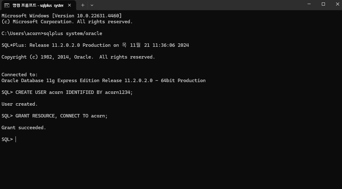SQL*Plus: Release 11.2.0.2.0 Production on 목 11월 21 13:00:09 2024