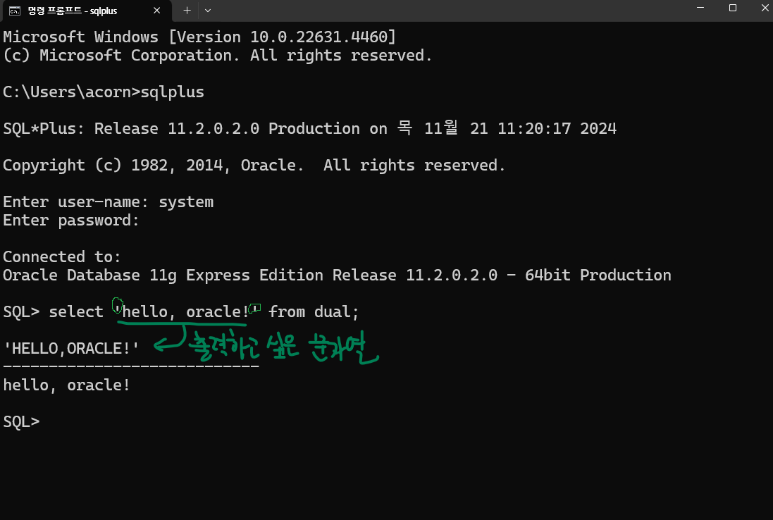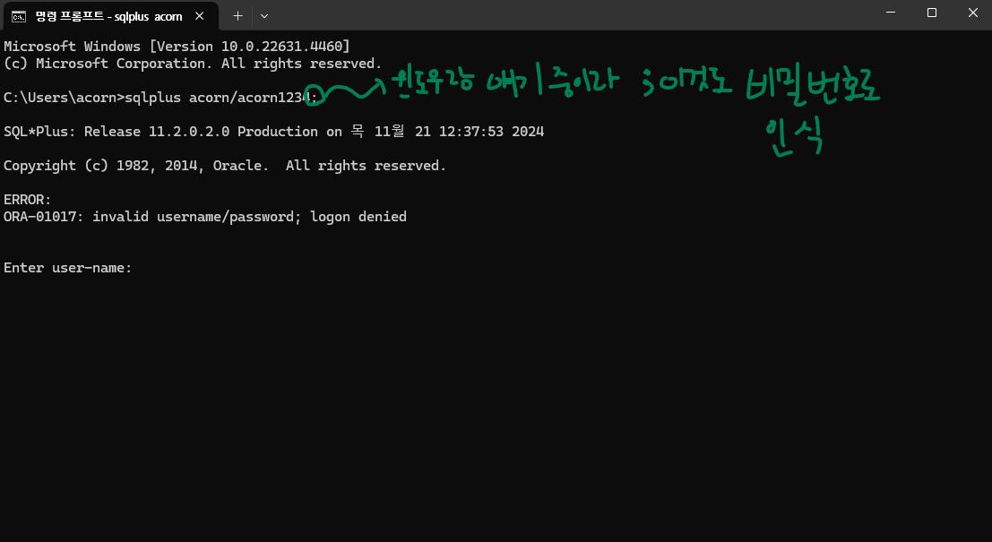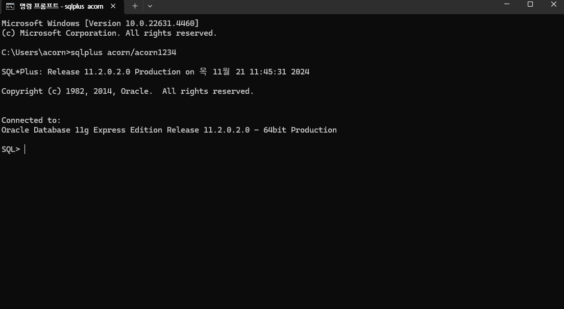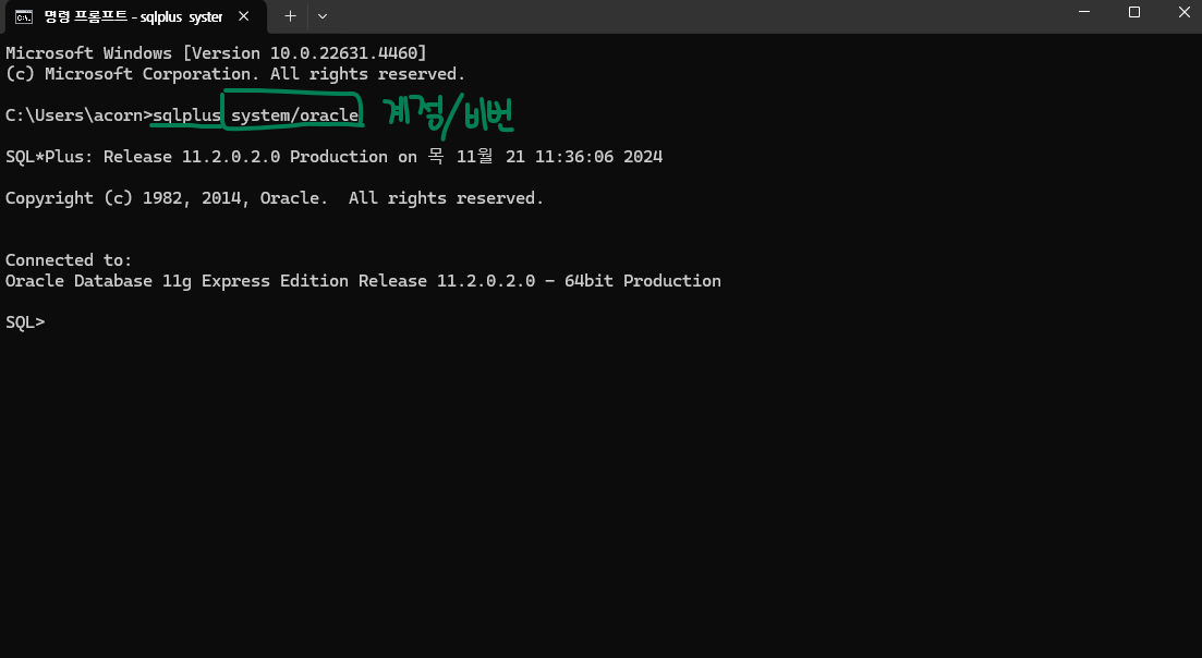 sqlplus 옆에 계정/비밀번호를 입력하고 엔터를 친다.