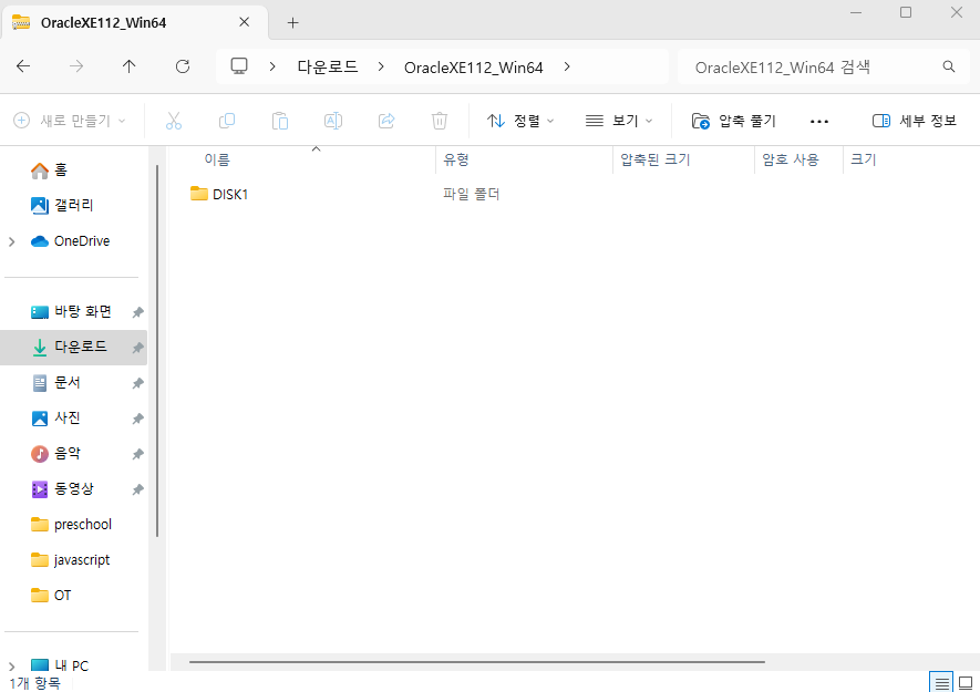 오라클은 다운로드 해놓으면 설치하는게 아니라 폴더로 다운로드 파일이 받아진다!