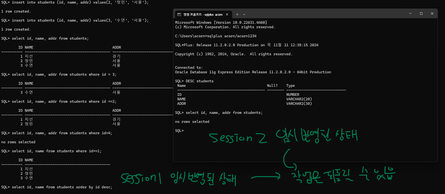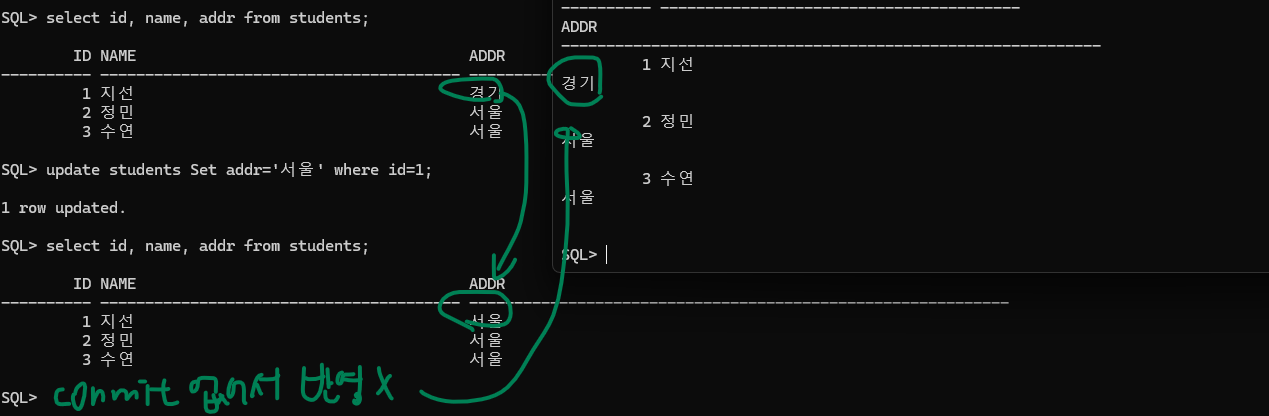 commit 없이 새로운 창에서 볼 때는 update(수정)된 값이 보이지 않고, 그 전에 commit한 값만 보인다.