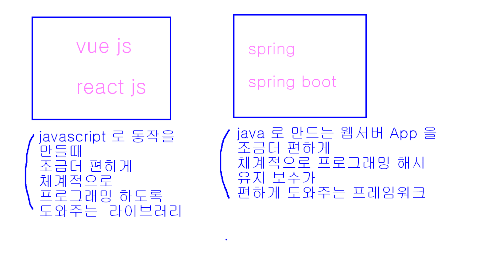 우리가 배우게 될 내용 중 vue js와 react js는 javascript의 응용 버전으로 편리하게 자바스크립트를 작성할 수 있도록 도와주게 이미 만들어진 라이브러리들이고,