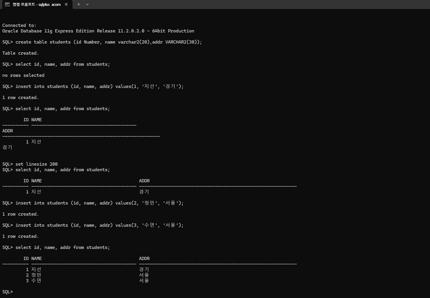 오라클을 설치하면 oracle은 백그라운드에서 실행되는 상태가 되고, 오라클에 접속하기 위해서는 명령 프롬프트를 사용해서 sqlplus를 불러야 한다.