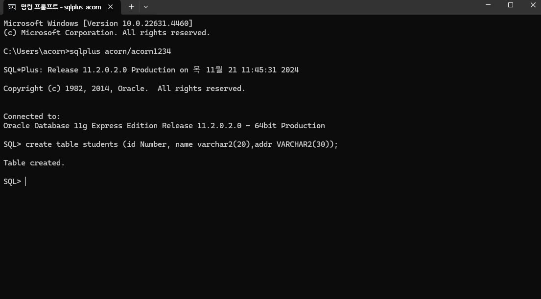 C:\Users\acorn>sqlplus acorn2/acorn1234