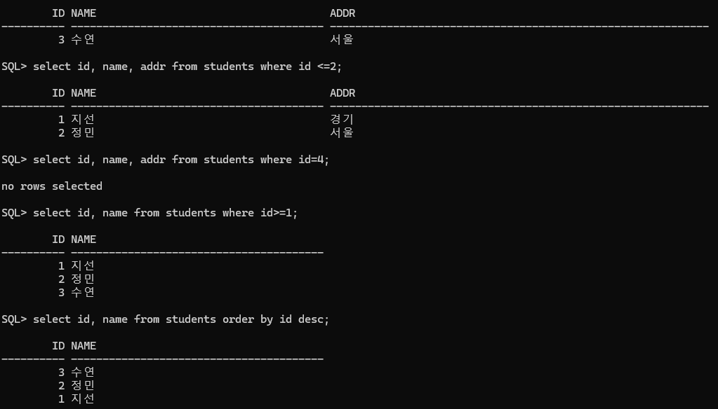 이 아래는 점심 시간 전에 sql 코드 배운 내용들을 전부 삽질해본 내용이다.