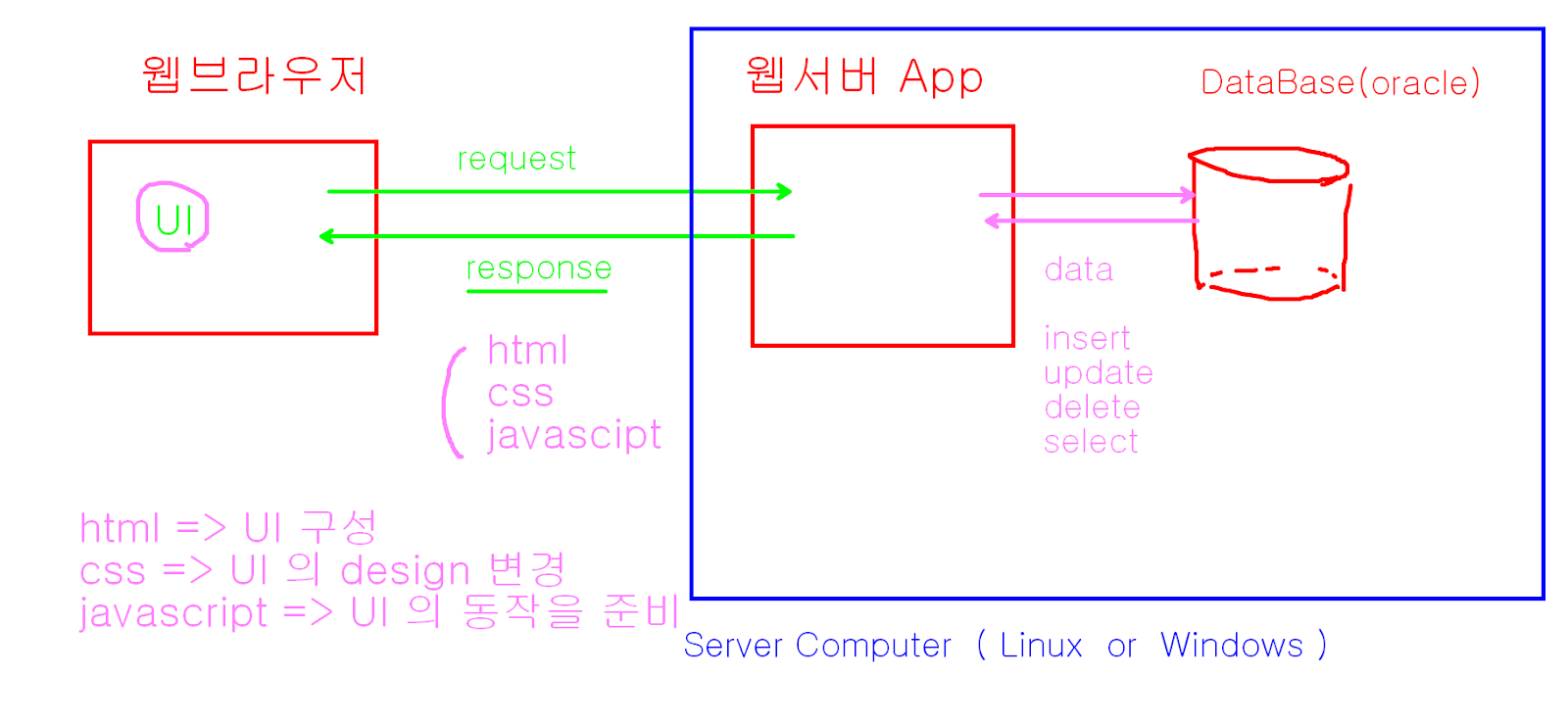 ③ html&css&javascript : 웹서버가 웹 브라우저에 response하는 방식으로 클라이언트 화면을 만들어주기 위해서