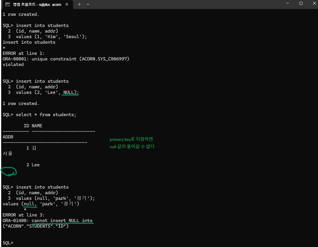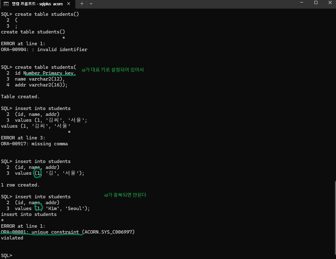 PRIMARY KEY 값으로 제약을 걸고 나면 인위적으로 ID가 중복인 값을 넣었을 때 unique constraint라는 오류가 나타나게 된다.