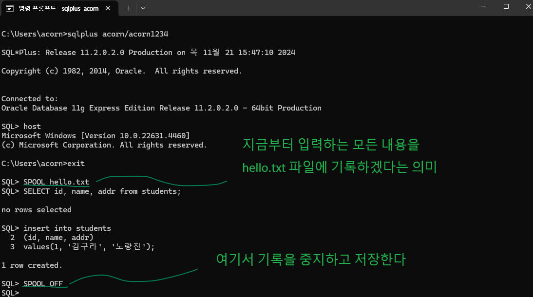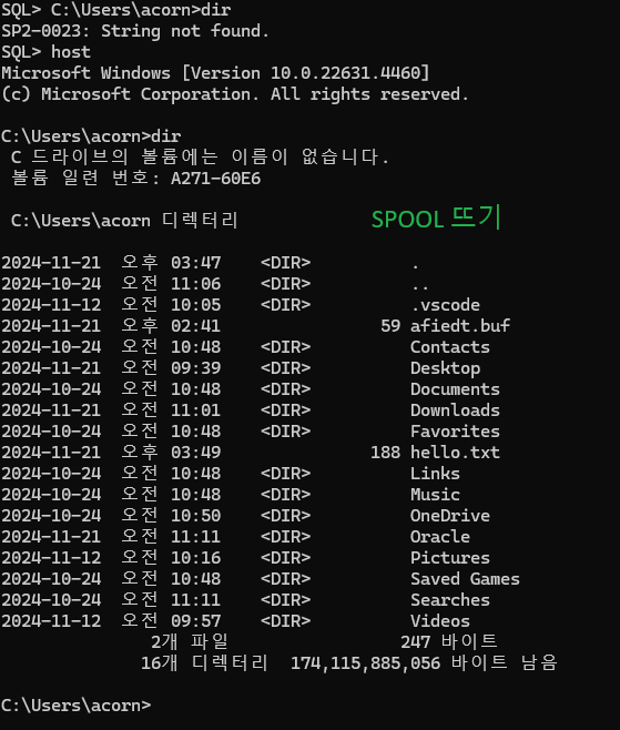 SPOOL 시작 지점부터 지정한 txt 파일(아래의 스크린샷에서는 hello.txt)에 SPOOL OFF로 닫기 전까지의 코드를 지정한 txt파일에 담아주는 기능을 가지고 있다.