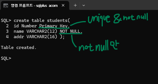 PRIMARY KEY라는 제약조건과 NOT NULL이라는 제약 조건에 대해서 배운다.