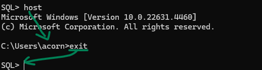 처음에 C:\Users\acorn이라고 사용자 폴더에 있는 acorn이 윈도우와 대화하는 창에서 sqlplus와 sql 코드를 사용할 수 있는 계정을 입력한 창에서 host를 입력하면 다시 윈도우와 대화할 수 있는 창으로 이동하고, 여기서 다시 exit을 누르면 sql 창으로 돌아오게 된다.