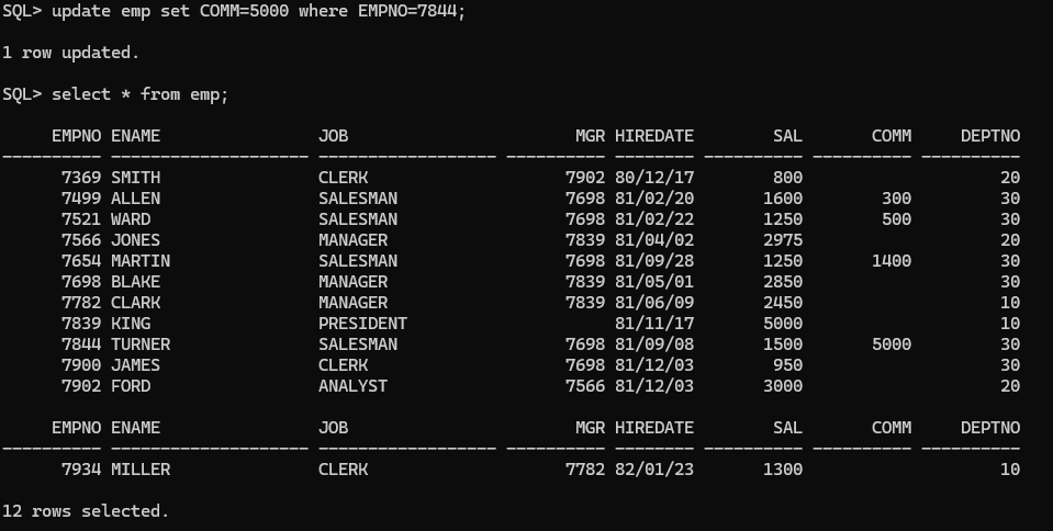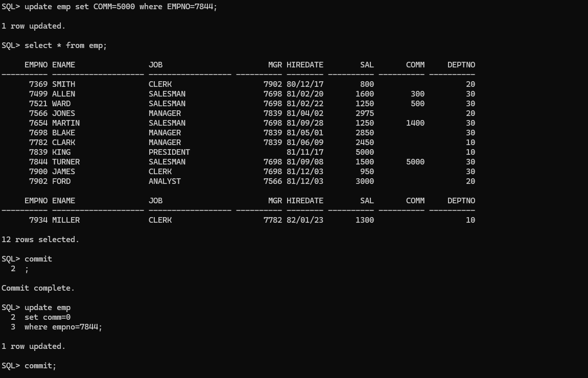 그래서 TURNER가 완전범죄를 저지르기 위해서는 5000으로 바꿔서 성과금을 받기 위해 Commit하여 저장하고, 성과금을 받고 나서 다시 성과금을 0으로 바꾼 내용을 commit해야 한다. (실제로 따라하지 마시오 범죄입니다)