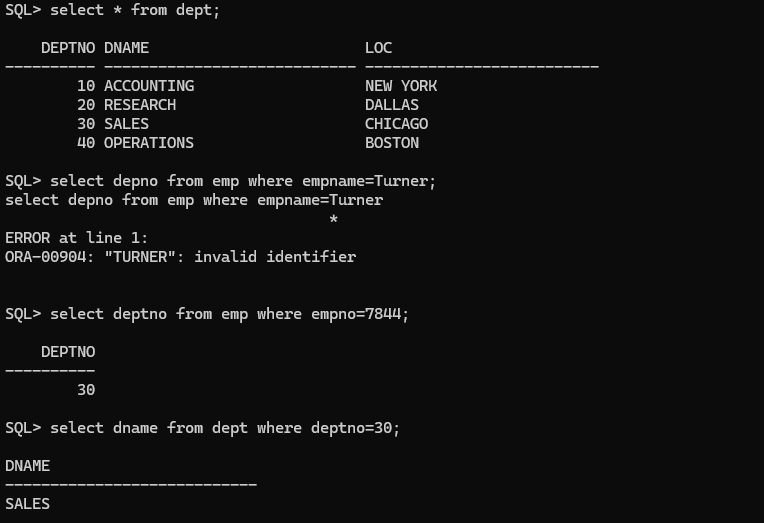 노가다로 한 번 select 문 돌리고, 또 한 번 노가다로 select 문 돌려서 Turner가 속한 부서의 이름을 알아내야 한다.