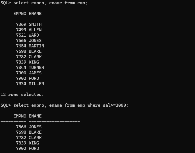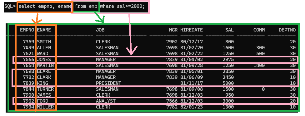 fron emp 에서 where 절로 필요 없는 row를 제거해내고, select로 칼럼만 선택해서, 필요한 row와 select로 추려진 칼럼만 남겨서 새로운 테이블 처럼 만들어지는 효과가 있음.