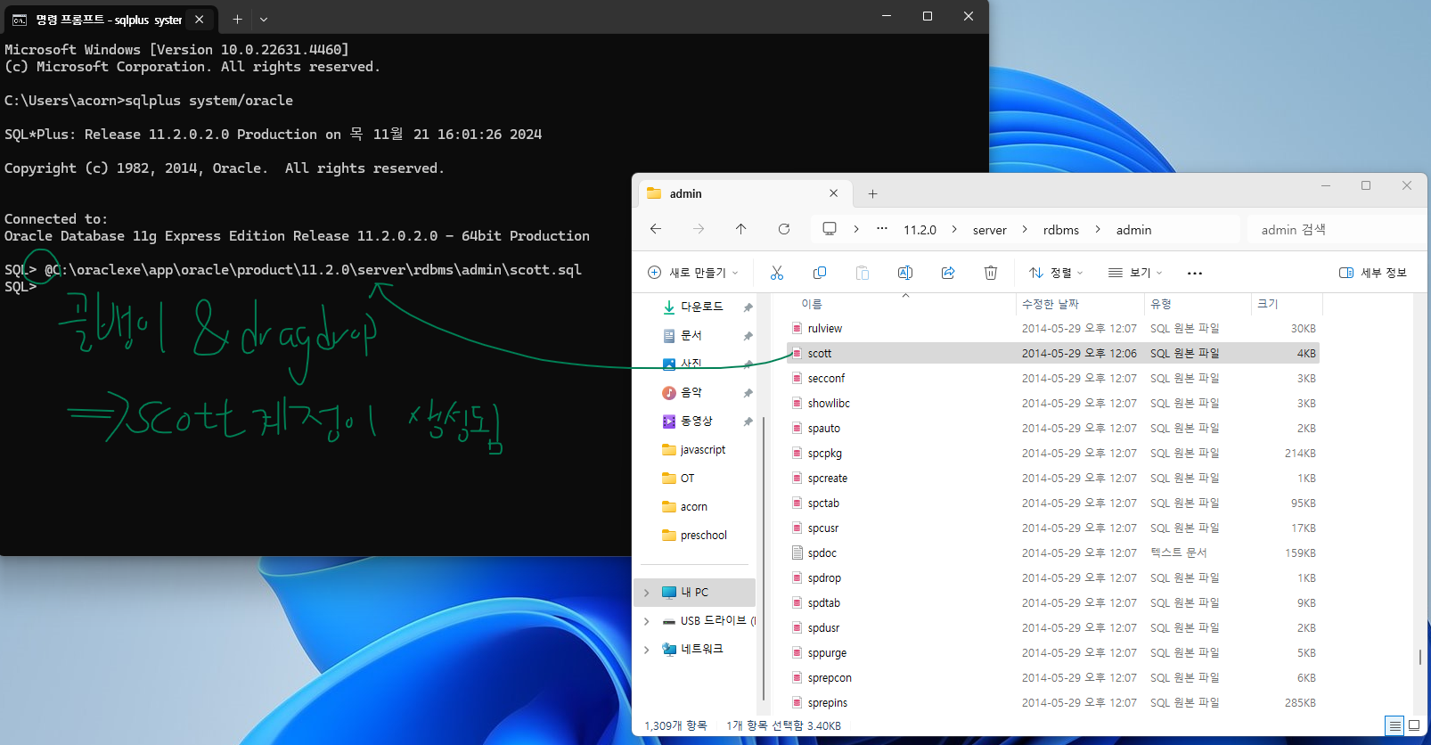 이 파일은 우리가 한동안 데이터베이스를 다루고 select 명령문을 다양하게 활용하며 배우는 데에 필요한 예제 테이블을 다 갖추고 있는 sql 계정이어서 추가해서 배우는데, 그 방법은 골뱅이를 누르고 drag&drop하여 추가하면 바로 scott 계정이 생성된다.