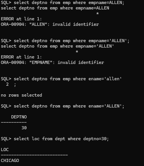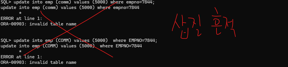 오라클에서 명령어는 대소문자 상관 없지만, 조회되는 데이터의 값은 대소문자, 데이터 종류의 구별(문자열이면 따옴표 쓰기)을 확실히 해줘야 한다.