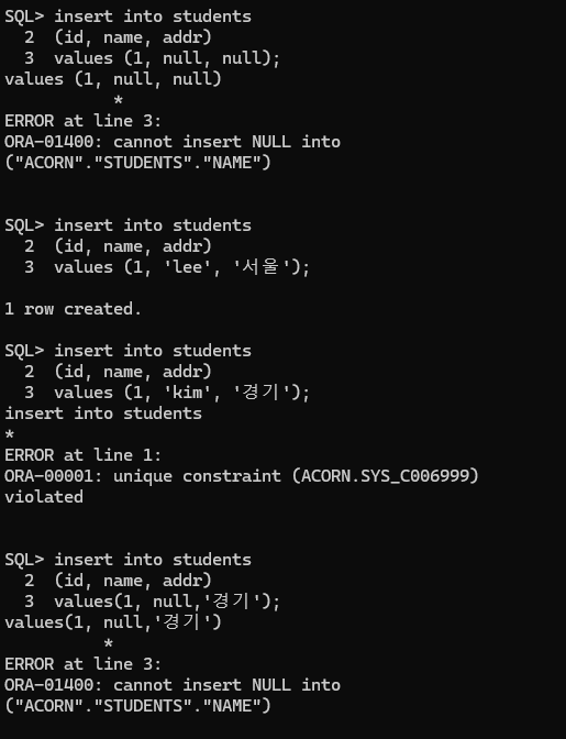 제약조건을 건 상태에서 다양한 경우를 시도했을 때 나타나는 에러를 모아놓은 삽질이다.