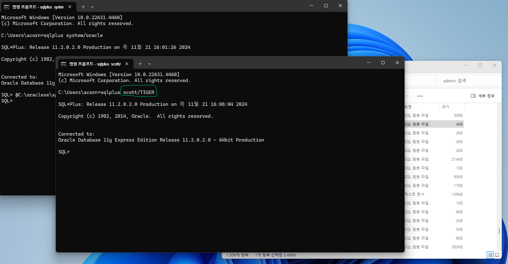 그래서 이제 새로운 창에서 scott이라는 아이디와 TIGER라는 비밀번호로 로그인한다.