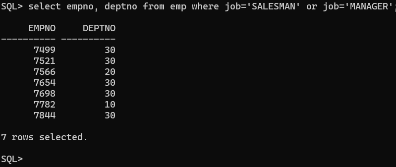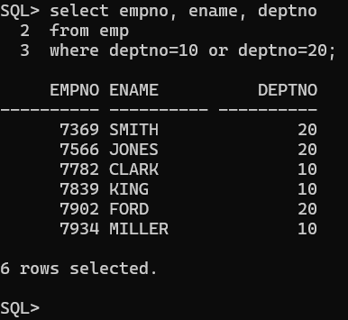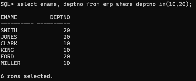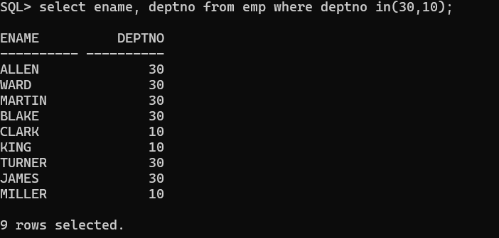 EMP 테이블에서 DEPTNO(부서번호)가 10, 20, 30 중 하나인 직원들의 ENAME, DEPTNO를 조회하세요. -> 변형해서 만듦