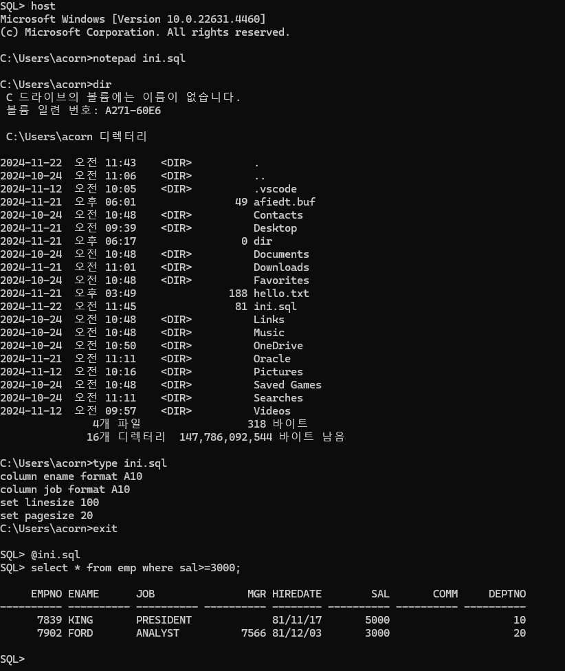 그 시작은 host로 나가서 메모장에 sql 파일을 만드는 것이다. ( notepad ini.sql )