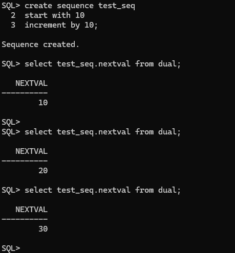 디폴트 값을 10으로 바꾸고 싶다면, start with 10이라는 조건을 추가하고 increment by 10;으로 완결하면 10부터 10씩 증가하는 시퀀스가 만들어진다.(다른 말로는 a1=10이라는 설정을 하고, 등차를 10인 등차수열을 만들겠다는 것)