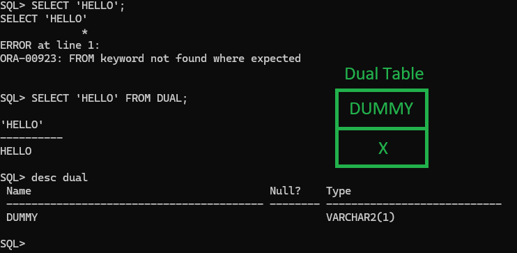 연산한 값을 dual로 조회할 때는 연산한 계산 식이나 계산식의 별칭이 DUMMY 자리에 들어가 칼럼 이름이 되고, X 자리에 연산된 값이 들어간다.