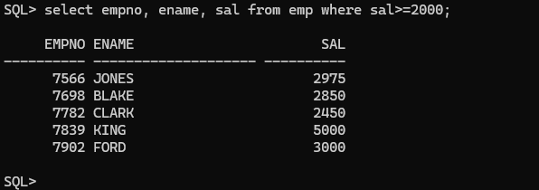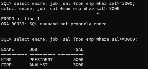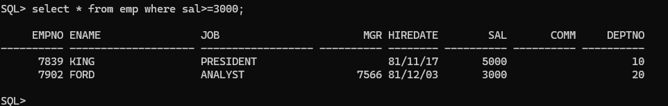 EMP 테이블에서 SAL(급여)가 3000 이상인 직원들의 ENAME(이름), JOB(직무), SAL을 조회하세요.