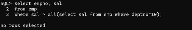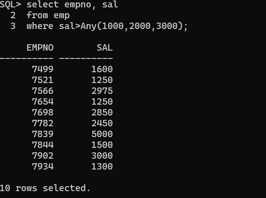 예시에서는 쓸모 없어보였지만, ANY 연산자를 쓰는 이유는 ()괄호 안에 SELECT 문이 들어갈 수 있기 때문에 배운다.