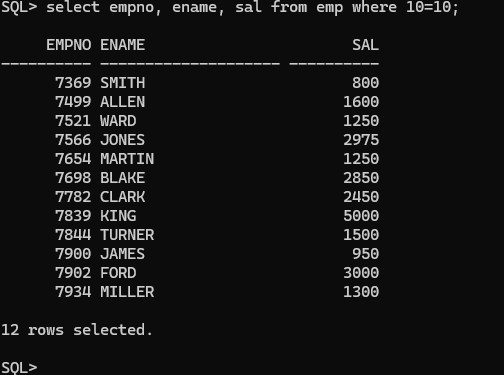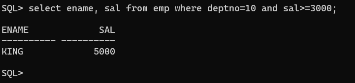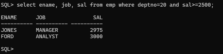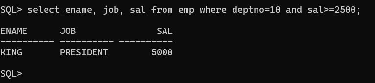 EMP 테이블에서 DEPTNO(부서번호)가 10번이고 SAL(급여)가 2500 이상인 직원들의 ENAME, JOB, SAL을 조회하세요.