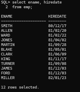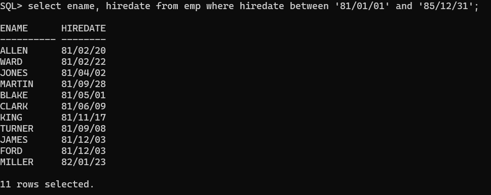 EMP 테이블에서 HIREDATE(입사일)가 '1981-01-01'과 '1985-12-31' 사이에 해당하는 직원들의 ENAME, HIREDATE를 조회하세요.