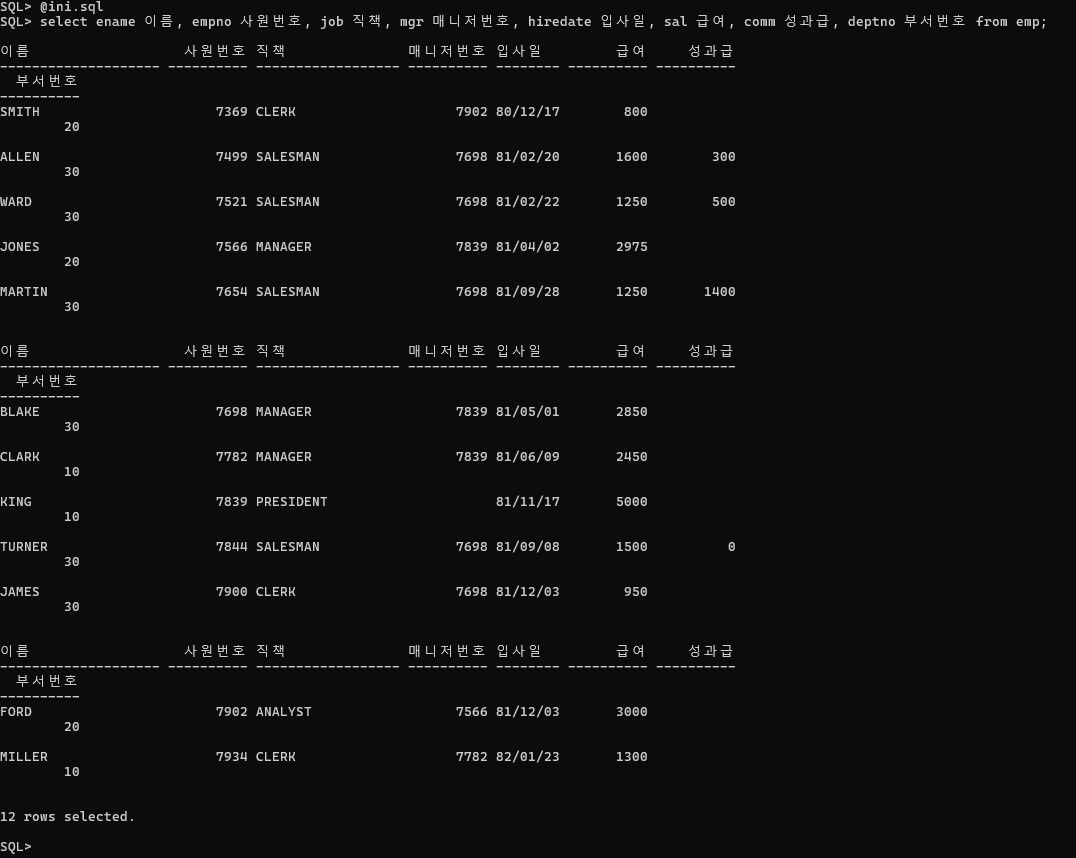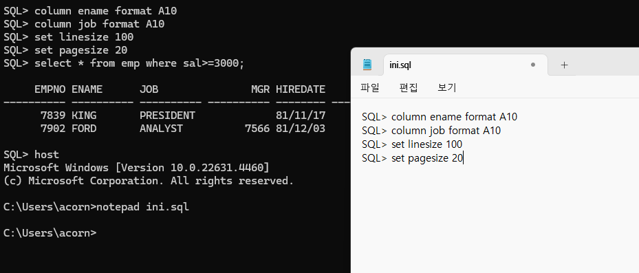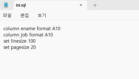 이렇게 ini.sql로 만든 파일은 프롬프트 창을 아예 닫았다가 끄고 다시 적용해도 쉽게 적용할 수 있다는 장점이 있다.