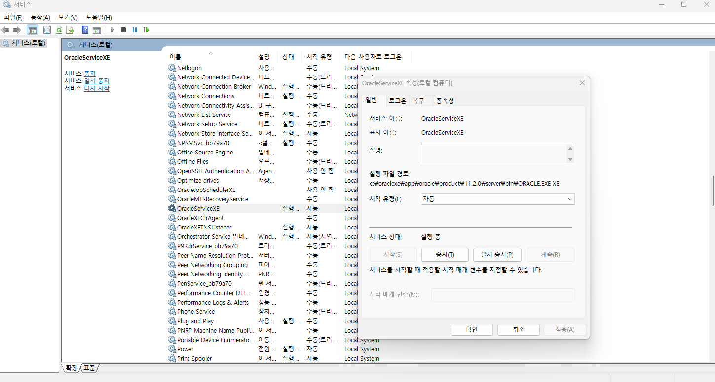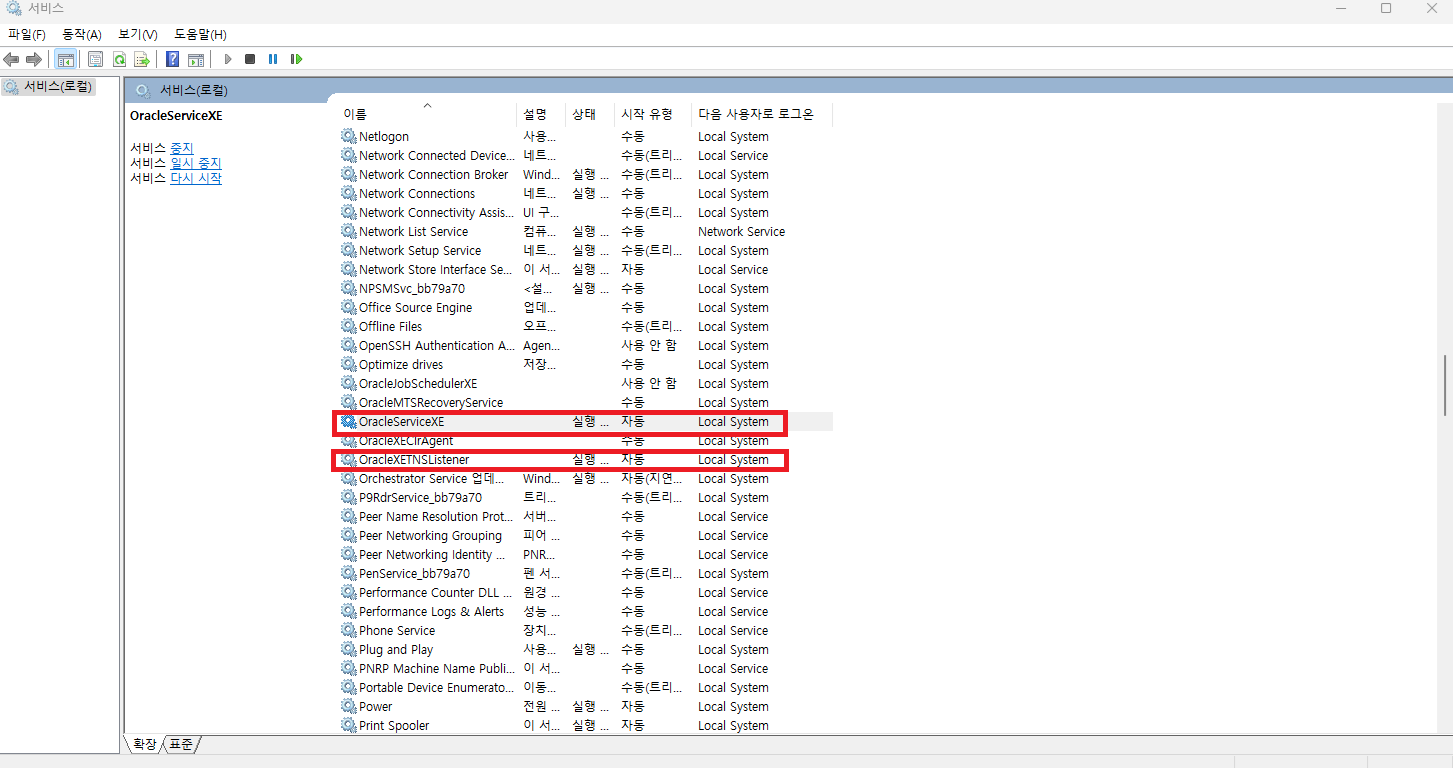 OracleServiceXE가 우리가 사용하는 오라클 앱이고, OracleXETNSListener가 누군가의 요청에 접속을 하게 해주는 리스너이다.