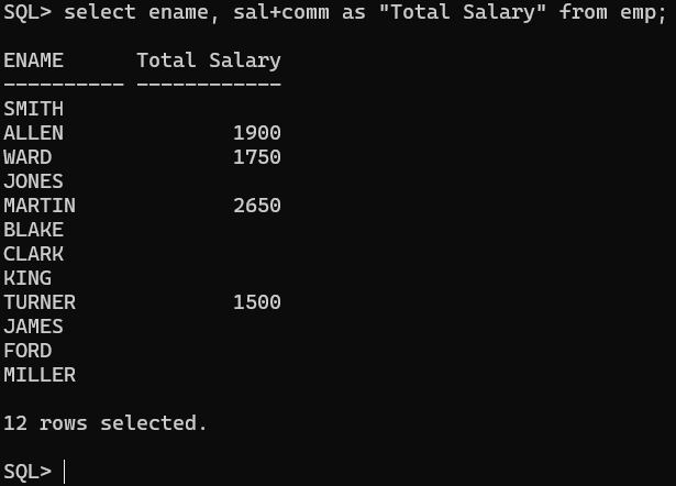 EMP 테이블에서 SAL(급여)과 COMM(수당)을 더한 값을 TOTAL_SALARY라는 이름으로 표시하며, ENAME, TOTAL_SALARY를 조회하세요.