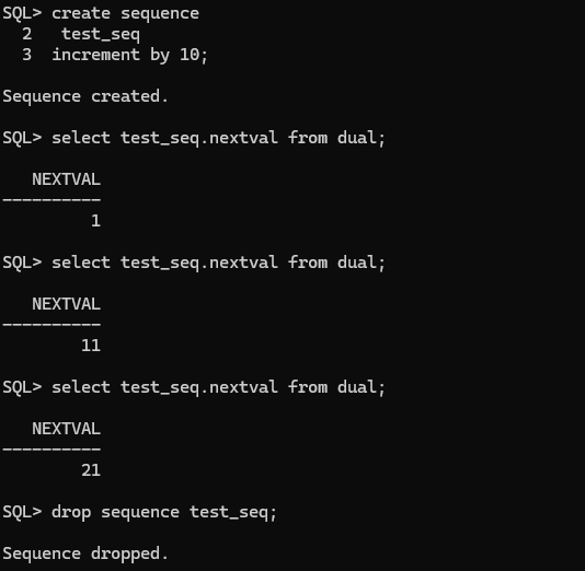 예를 들어 10씩 증가하는 시퀀스를 만들기 위해 increment by 10;이란 조건을 추가하면 디폴트 값인 1부터 10씩 증가하는 시퀀스가 만들어진다. (다른 말로는 a1= 1이고 공차가 +10 인 수열이 만들어진다는거)