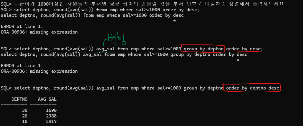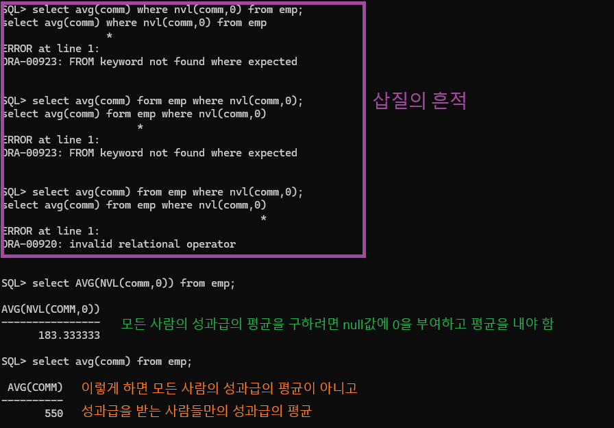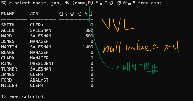 지난 시간에는 NVL(null 값이 존재하는 변수, null 값에 집어 넣을 수) 함수를 배우지 않아서 위 질문에 대한 답을 아래와 같이 했었다.