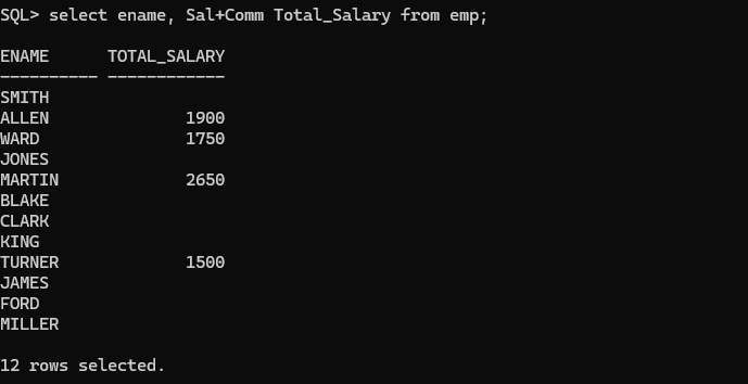 SQL> select ename, sal+nvl(comm,0) total_salary