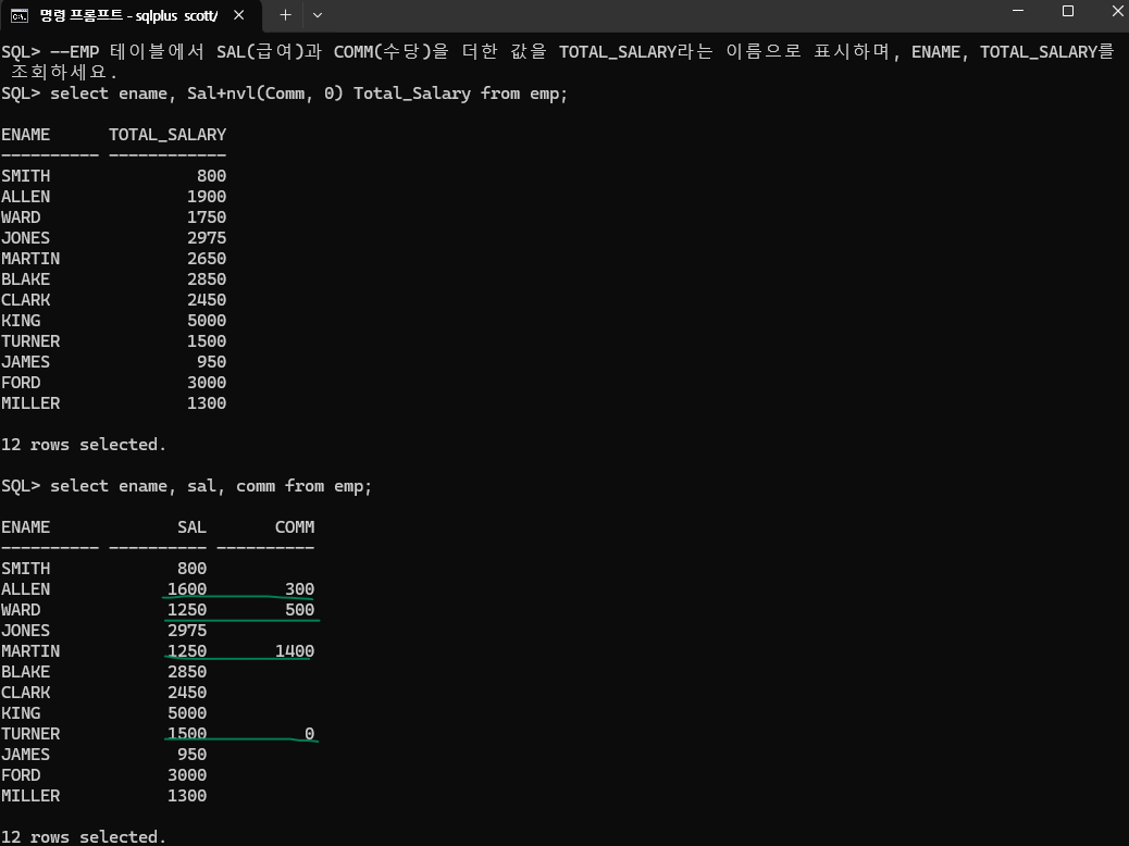nvl(comm,0)과 sal을 더해서 Total_Salary 라는 별칭을 주고 select 하는 것이다.