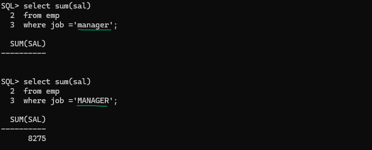※ row의 각 데이터만 대소문자가 구별되고, 명령어나 칼럼명 등의 식별자들은 대소문자를 가리지 않는다.