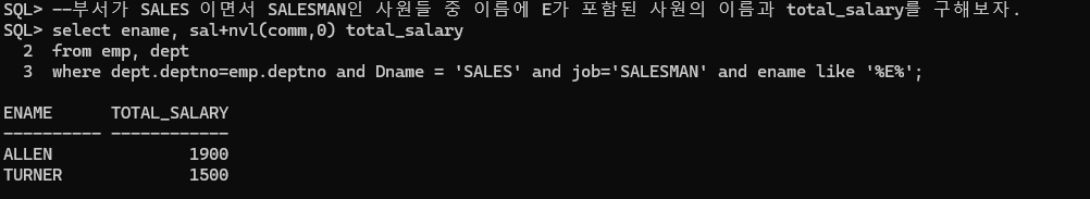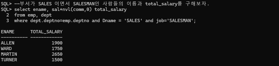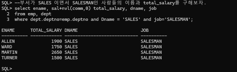 그럼 또 이거 응용으로 부서가 SALES이면서 SALESMAN인 사람들의 이름과 total_salary를 구해보자.