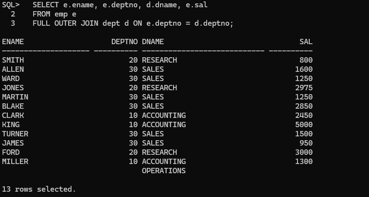 2 select empno, ename, sal, deptno, dname